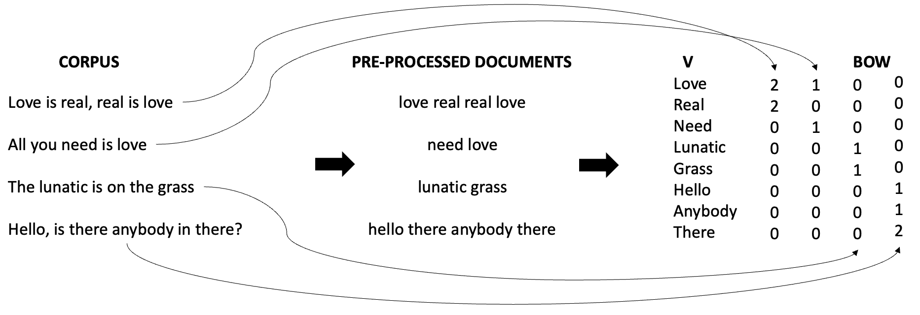 The figure below shows how a text is converted into a vector of word counts. Note that in this process, we usually remove some less meaningful works such as articles and prepositions, which are usually called “stop words”: