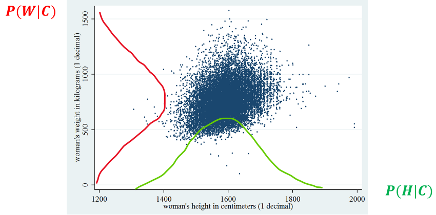 Let us consider again our sex classification example based on height and weight. We will consider \(X = \lbrack H,W\rbrack\), which are random variables representing heights and weights of subjects. If we assume that the data is approximately Gaussian, the probabilities \(P(H|C)\) and \(P(W|C)\) can be modeled with univariate (1D) Gaussian distributions. This is done by first obtaining four samples: